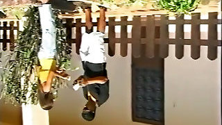 Hairy ladies having vintage outdoors threesome sex in the backyard