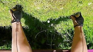 Vintage chick's outdoor kinky lingerie and masturbation show - including seamed nylon stockings and vintage panties.